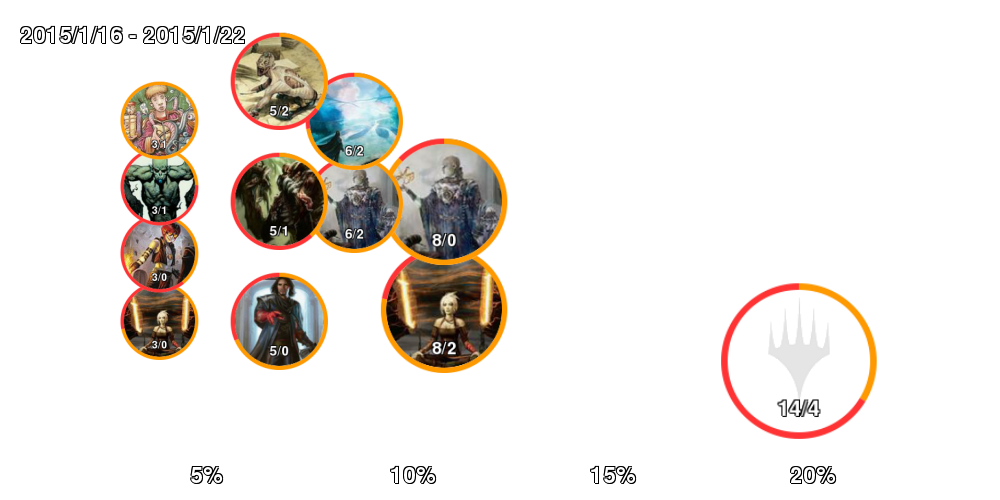 | アイコン中の数字は「掲載デッキ数/4-0デッキ数」。 アイコンの縁はオレンジの方が長ければ勢力拡大中、赤ならば勢力衰退中。 右側に行くほどTier1に近づいていき、下側に行くほどコントロール色が強くなる。 ただしアイコンが重ならないことを優先しているので位置はおおよそのもの。 |