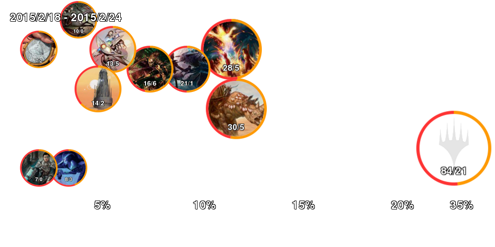 | アイコン中の数字は「掲載デッキ数/4-0デッキ数」。 アイコンの縁はオレンジの方が長ければ勢力拡大中、赤ならば勢力衰退中。 右側に行くほどTier1に近づいていき、下側に行くほどコントロール色が強くなる。 ただしアイコンが重ならないことを優先しているので位置はおおよそのもの。 |