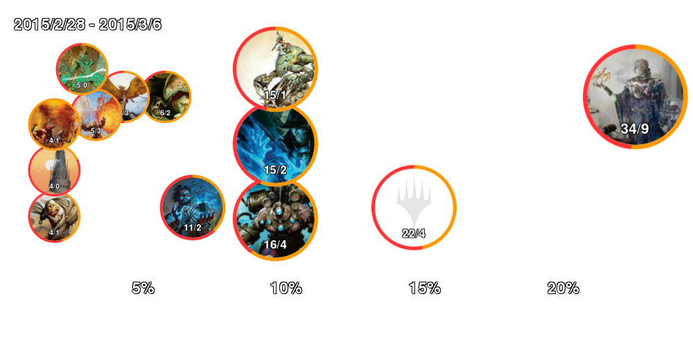 | アイコン中の数字は「掲載デッキ数/4-0デッキ数」。 アイコンの縁はオレンジの方が長ければ勢力拡大中、赤ならば勢力衰退中。 右側に行くほどTier1に近づいていき、下側に行くほどコントロール色が強くなる。 ただしアイコンが重ならないことを優先しているので位置はおおよそのもの。 |