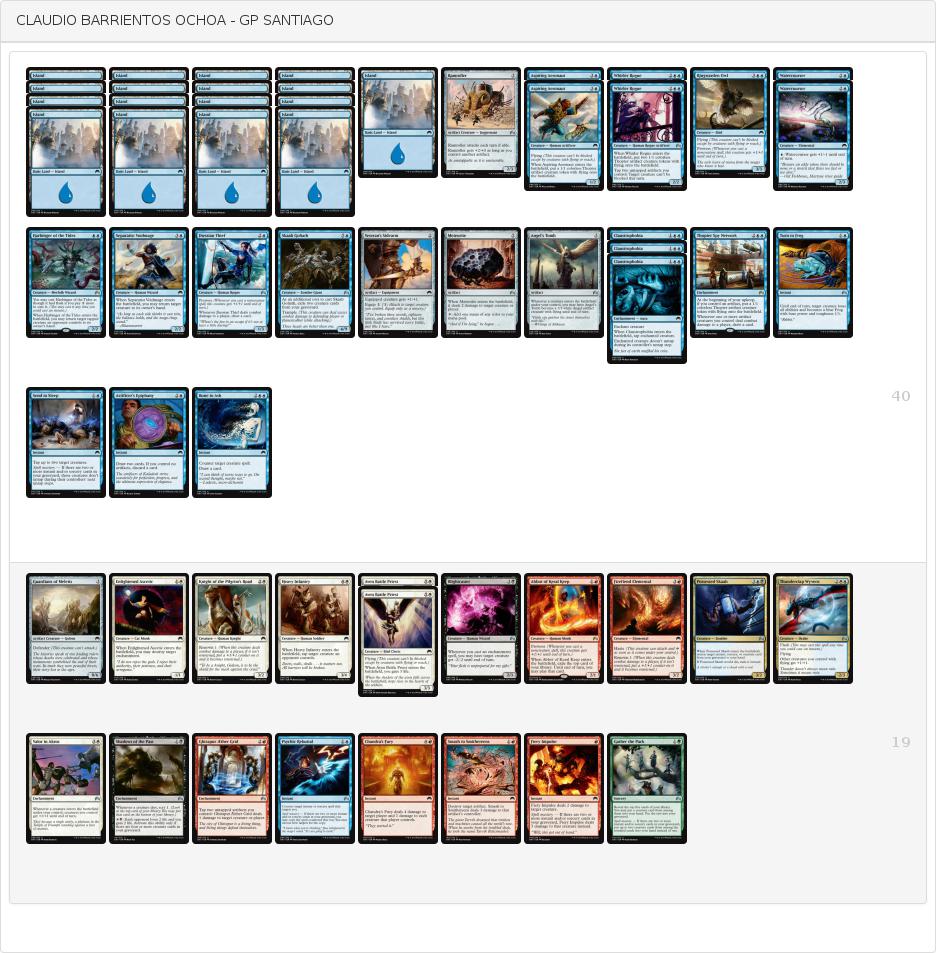1 《城塞の主》1 《跳ねる混成体》 1 《メレティスの守護者》 1 《戦乱の神託者》 1 《臨海の護衛》 1 《ナントゥーコの鞘虫》 1 《ふいごトカゲ》 1 《抑制する縛め》 1 《秘儀術師の掌握》 2 《層雲歩み》 1 《冥府の傷跡》 1 《精霊の絆》 1 《蔦の罠》 1 《回収》 1 《治癒の手》 1 《戦慄水》 1 《死の円舞曲》 -サイドボード(18)-