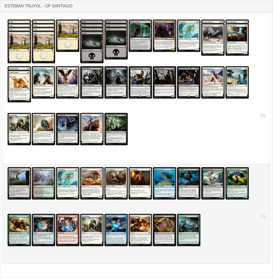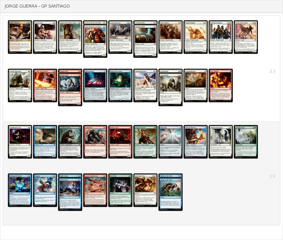 1 《メレティスの守護者》1 《悟った苦行者》 1 《巡礼者の道の騎士》 1 《重歩兵》 2 《エイヴンの戦僧侶》 1 《荒廃唱え》 1 《ケラル砦の修道院長》 1 《炎魔の精霊》 1 《取り憑かれたスカーブ》 1 《雷鳴のワイヴァーン》 1 《アクロスでの武勇》 1 《過去の過ち》 1 《ギラプールの霊気格子》 1 《精神的反論》 1 《チャンドラの憤怒》 1 《粉々》 1 《焦熱の衝動》 1 《群れの結集》 -サイドボード(19)-