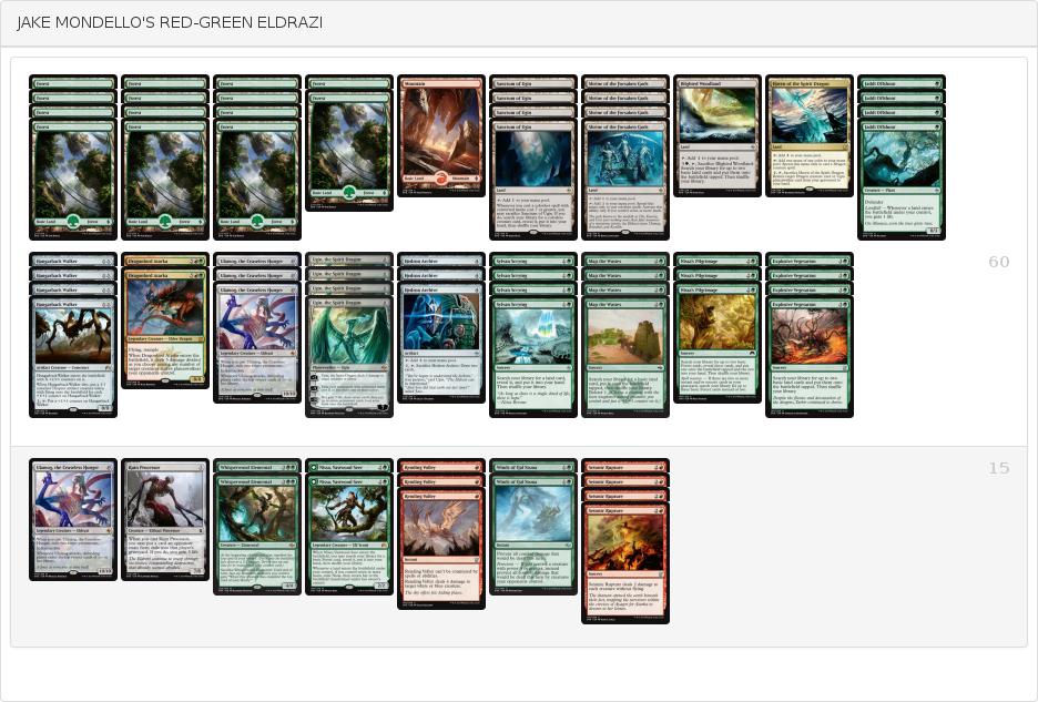 1 《絶え間ない飢餓、ウラモグ》1 《破滅の昇華者》 2 《囁きの森の精霊》 2 《巨森の予見者、ニッサ》 3 《引き裂く流弾》 2 《カル・シスマの風》 4 《大地の断裂》 -サイドボード(15)-