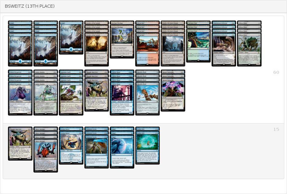 スタンダードでもランプせずにモダンのように殴り勝つエルドラージデッキが出てきました。400名以上が参加したMOCSで上位進出を果たしたこのアグロは青単でマナカーブにそってエルドラージを次々展開。除去や妨害、強化もしっかり行えるという非常によくまとまったビートダウンデッキになっています。