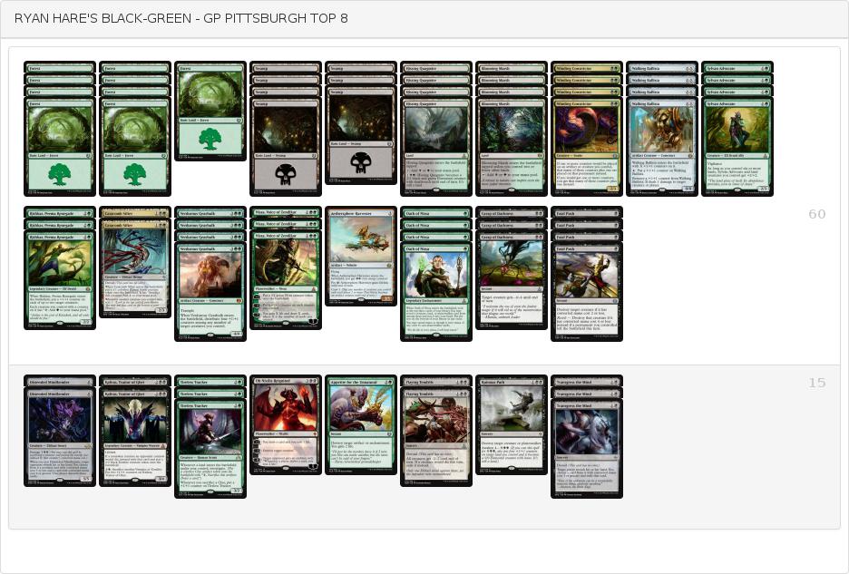 PTでは勝ちきれなかった緑黒ですが翌週のGPでは見事巻き返しに成功。TOP32の半分を昂揚型、エネルギー型など様々な緑黒で制圧しました。そして優勝したのはオーソドックスな緑黒デッキ。巻きつき蛇のシナジーを使い倒してもりもり育てて圧倒します。蛇、リシュカー、機械巨人を軸にニッサや地下墓地の選別者で横展開もしっかりと行ってカウンターをばらまけるように構築しています。蛇がいればあっという間に決着をつけてくれますし、いなくてもニッサや機械巨人によるサイズアップだけでも十分に強力なのはカラデシュ以前の環境で幾度となく証明されています。