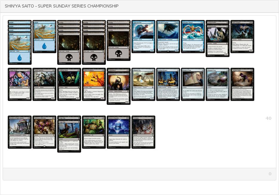 SUPER SUNDAY SERIES CHAMPIONSHIP 2017が混合フォーマットで開催されエターナルマスターズドラフトで行われたプレーオフを黒青が優勝しました。世界中で開催されるグランプリ恒例のSSS予選を抜けたプレイヤー達によって毎年行われているイベントですがどうやら今回が最後の開催となるらしく、最後の王者には見事日本人の斎藤慎也選手が輝きました。おめでとうございます。
