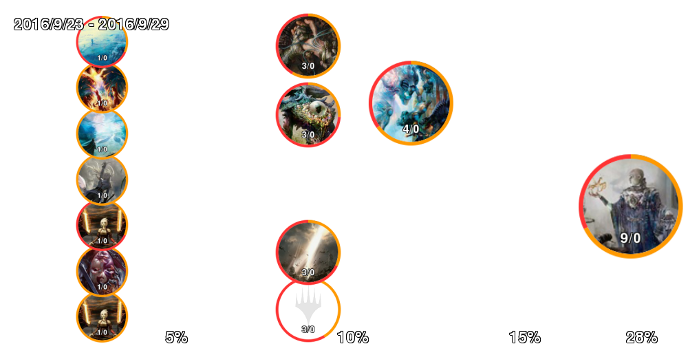 | アイコン中の数字は「掲載デッキ数/4-0デッキ数」。 アイコンの縁はオレンジの方が長ければ勢力拡大中、赤ならば勢力衰退中。 右側に行くほどTier1に近づいていき、下側に行くほどコントロール色が強くなる。 ただしアイコンが重ならないことを優先しているので位置はおおよそのもの。 |