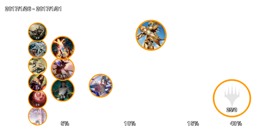 | アイコン中の数字は「掲載デッキ数/4-0デッキ数」。 アイコンの縁はオレンジの方が長ければ勢力拡大中、赤ならば勢力衰退中。 右側に行くほどTier1に近づいていき、下側に行くほどコントロール色が強くなる。 ただしアイコンが重ならないことを優先しているので位置はおおよそのもの。 |