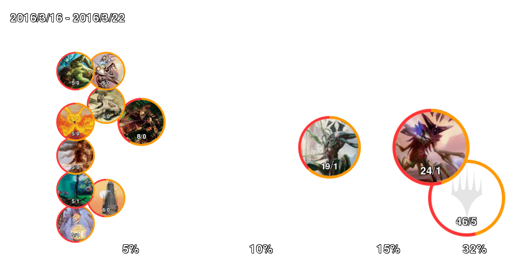 | アイコン中の数字は「掲載デッキ数/4-0デッキ数」。 アイコンの縁はオレンジの方が長ければ勢力拡大中、赤ならば勢力衰退中。 右側に行くほどTier1に近づいていき、下側に行くほどコントロール色が強くなる。 ただしアイコンが重ならないことを優先しているので位置はおおよそのもの。 |