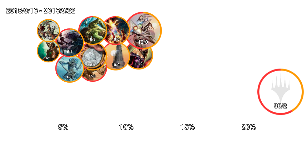 | アイコン中の数字は「掲載デッキ数/4-0デッキ数」。 アイコンの縁はオレンジの方が長ければ勢力拡大中、赤ならば勢力衰退中。 右側に行くほどTier1に近づいていき、下側に行くほどコントロール色が強くなる。 ただしアイコンが重ならないことを優先しているので位置はおおよそのもの。 |