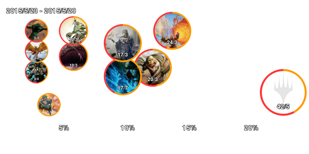 | アイコン中の数字は「掲載デッキ数/4-0デッキ数」。 アイコンの縁はオレンジの方が長ければ勢力拡大中、赤ならば勢力衰退中。 右側に行くほどTier1に近づいていき、下側に行くほどコントロール色が強くなる。 ただしアイコンが重ならないことを優先しているので位置はおおよそのもの。 |