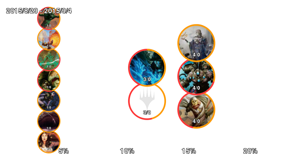 | アイコン中の数字は「掲載デッキ数/4-0デッキ数」。 アイコンの縁はオレンジの方が長ければ勢力拡大中、赤ならば勢力衰退中。 右側に行くほどTier1に近づいていき、下側に行くほどコントロール色が強くなる。 ただしアイコンが重ならないことを優先しているので位置はおおよそのもの。 |