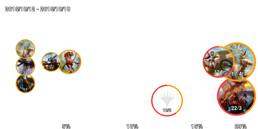 | アイコン中の数字は「掲載デッキ数/4-0デッキ数」。 アイコンの縁はオレンジの方が長ければ勢力拡大中、赤ならば勢力衰退中。 右側に行くほどTier1に近づいていき、下側に行くほどコントロール色が強くなる。 ただしアイコンが重ならないことを優先しているので位置はおおよそのもの。 |