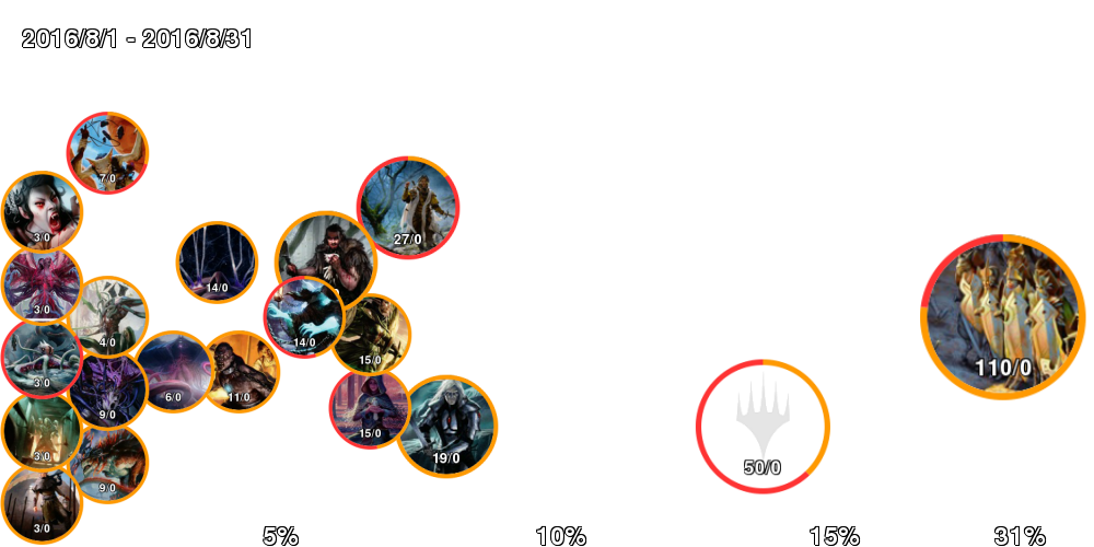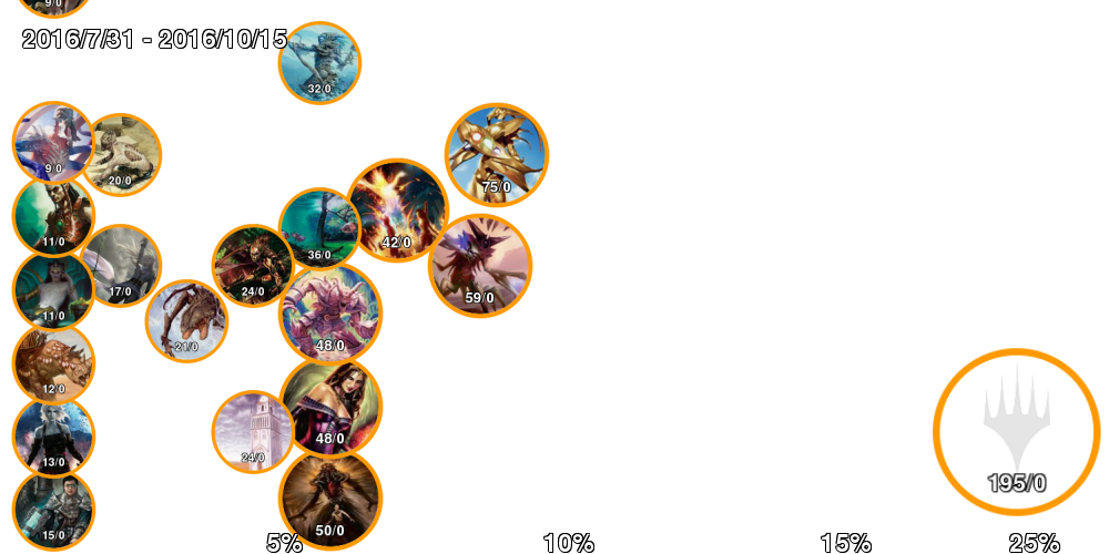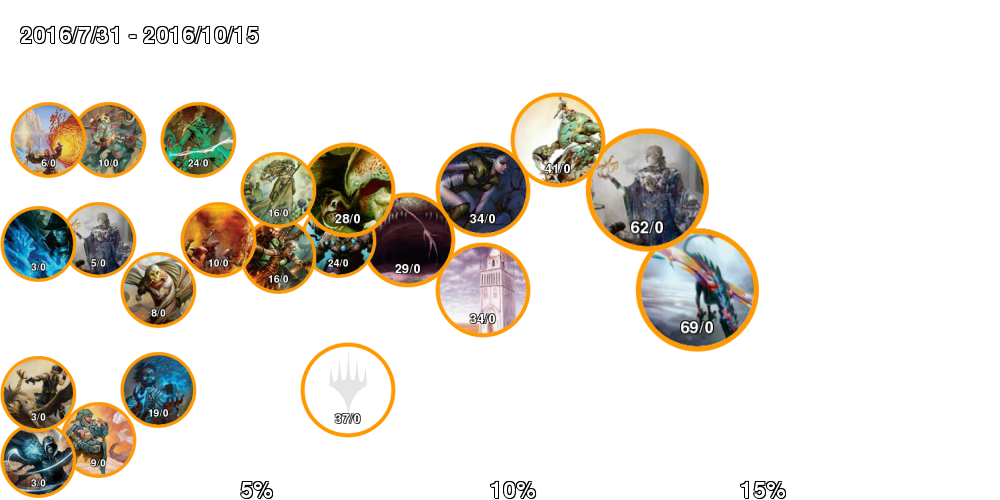 | アイコン中の数字は「掲載デッキ数/4-0デッキ数」。 アイコンの縁はオレンジの方が長ければ勢力拡大中、赤ならば勢力衰退中。 右側に行くほどTier1に近づいていき、下側に行くほどコントロール色が強くなる。 ただしアイコンが重ならないことを優先しているので位置はおおよそのもの。 |