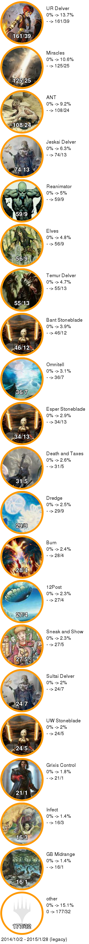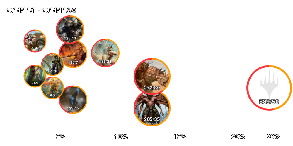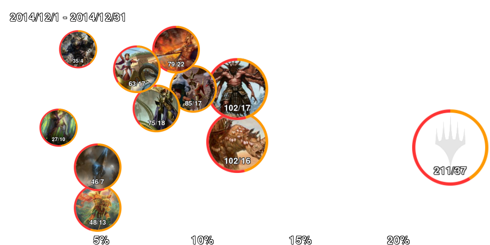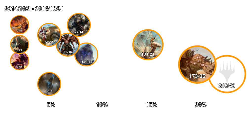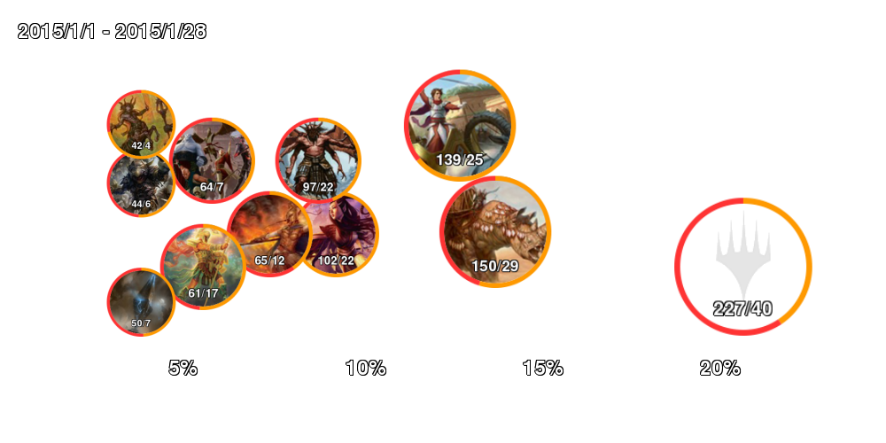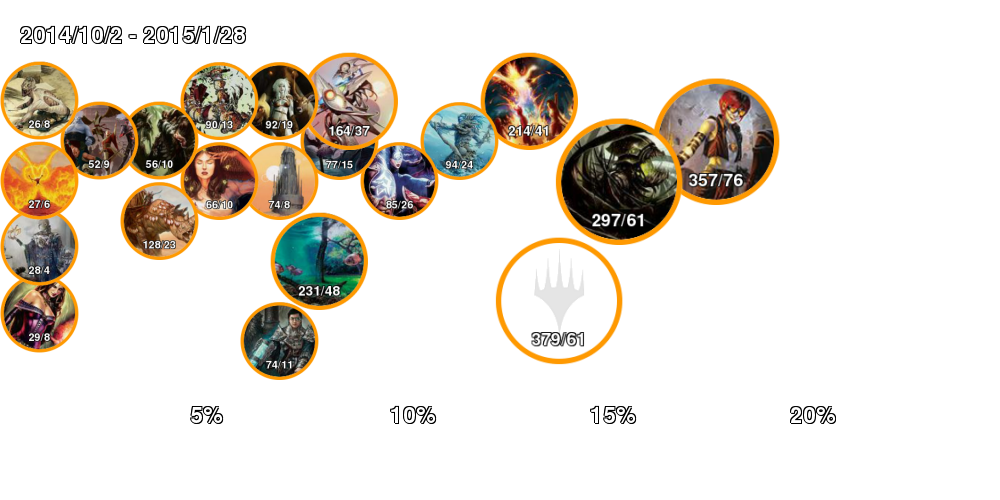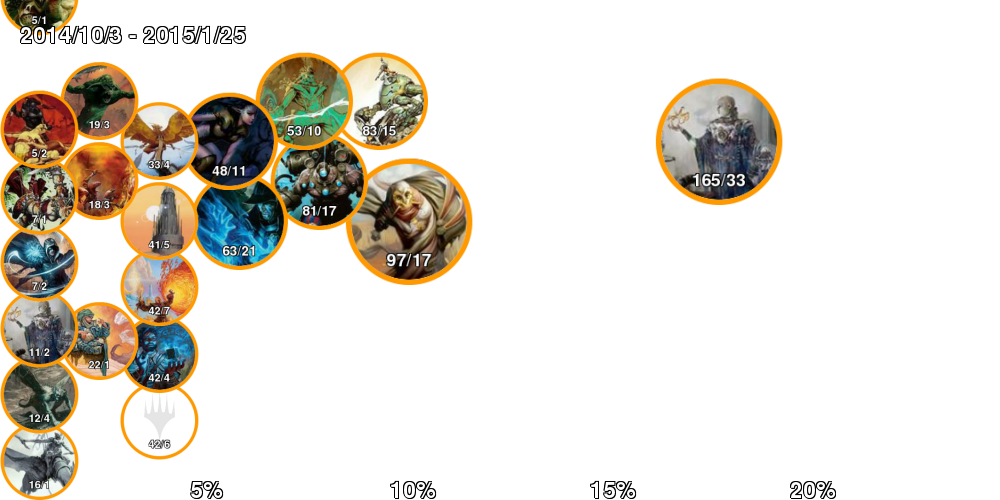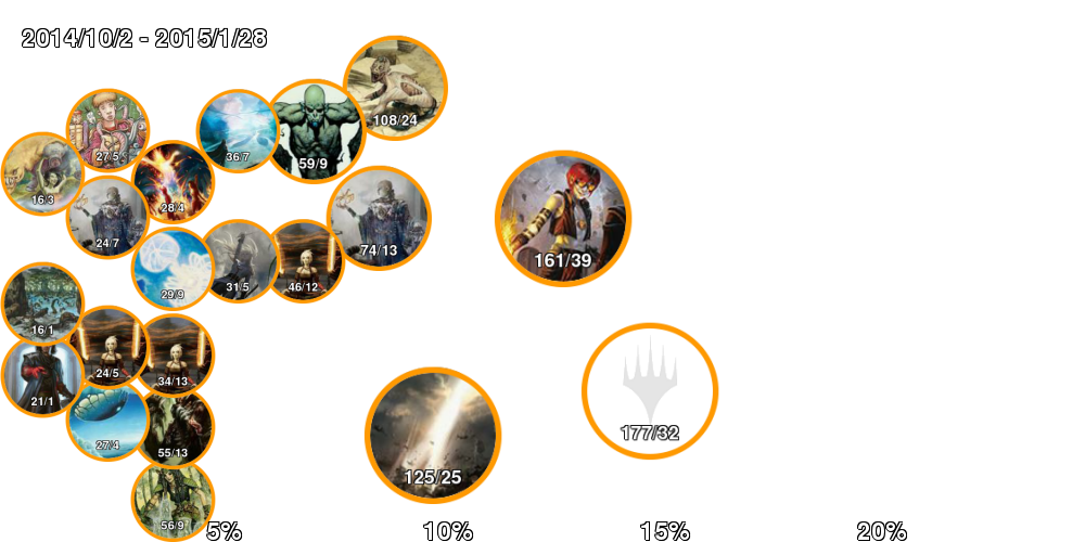 | アイコン中の数字は「掲載デッキ数/4-0デッキ数」。 アイコンの縁はオレンジの方が長ければ勢力拡大中、赤ならば勢力衰退中。 右側に行くほどTier1に近づいていき、下側に行くほどコントロール色が強くなる。 ただしアイコンが重ならないことを優先しているので位置はおおよそのもの。 |