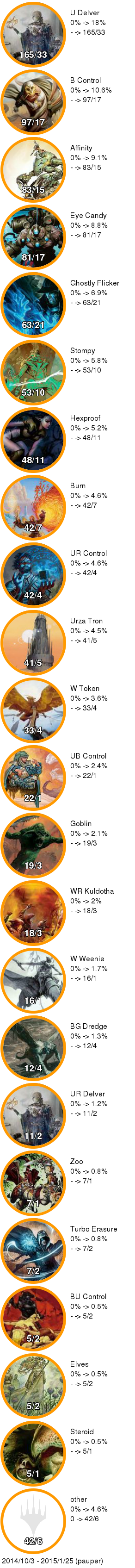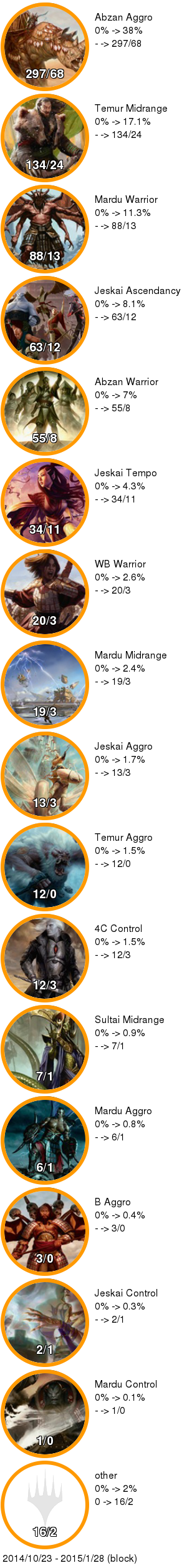MOでも運命再編プレリリースイベントが始まりタルキール環境の幕が下りました。そこで総まとめということでいつもの倍詰め込んでタルキール環境でどんなデッキがどれだけ勝っていたのか見てみます。アブザンミッドレンジはどの時期も常に強かったまさにタルキール環境を代表するデッキですがトータルで見てみるとそれほど飛び抜けた存在ではなく全体の15%もありませんでした。