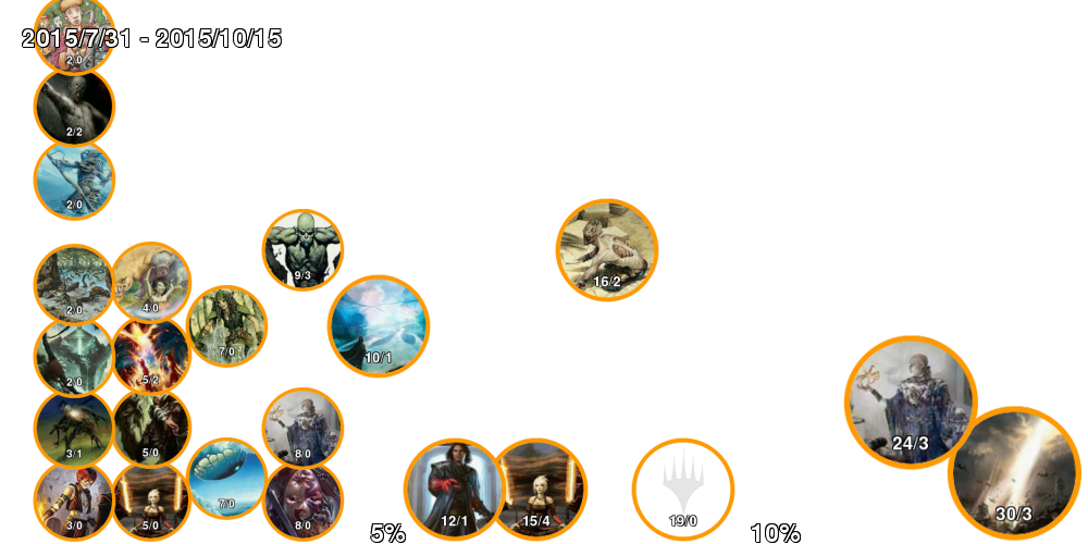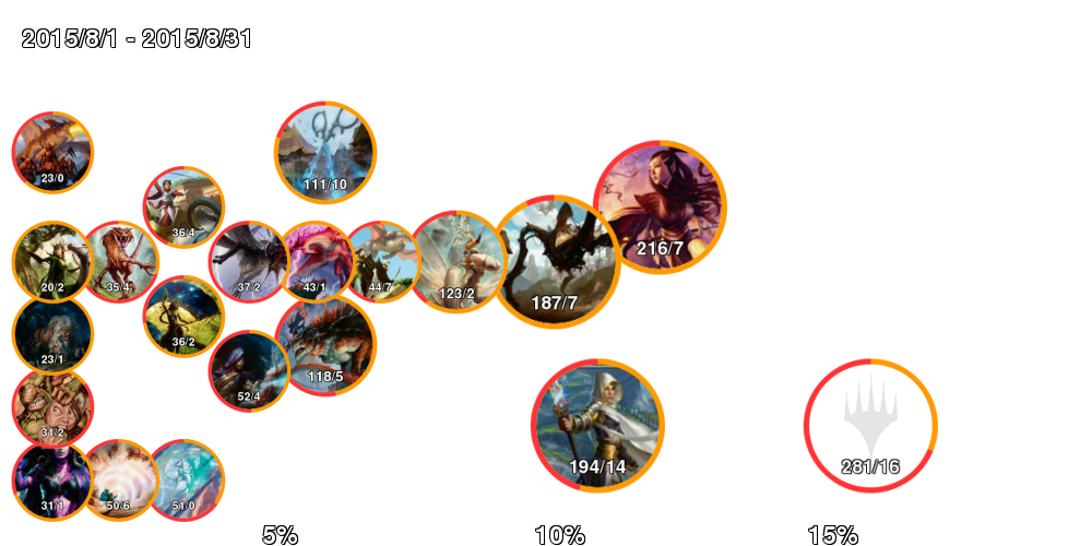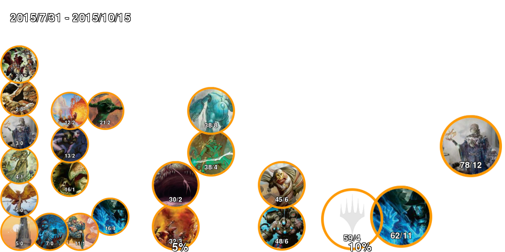 | アイコン中の数字は「掲載デッキ数/4-0デッキ数」。 アイコンの縁はオレンジの方が長ければ勢力拡大中、赤ならば勢力衰退中。 右側に行くほどTier1に近づいていき、下側に行くほどコントロール色が強くなる。 ただしアイコンが重ならないことを優先しているので位置はおおよそのもの。 |