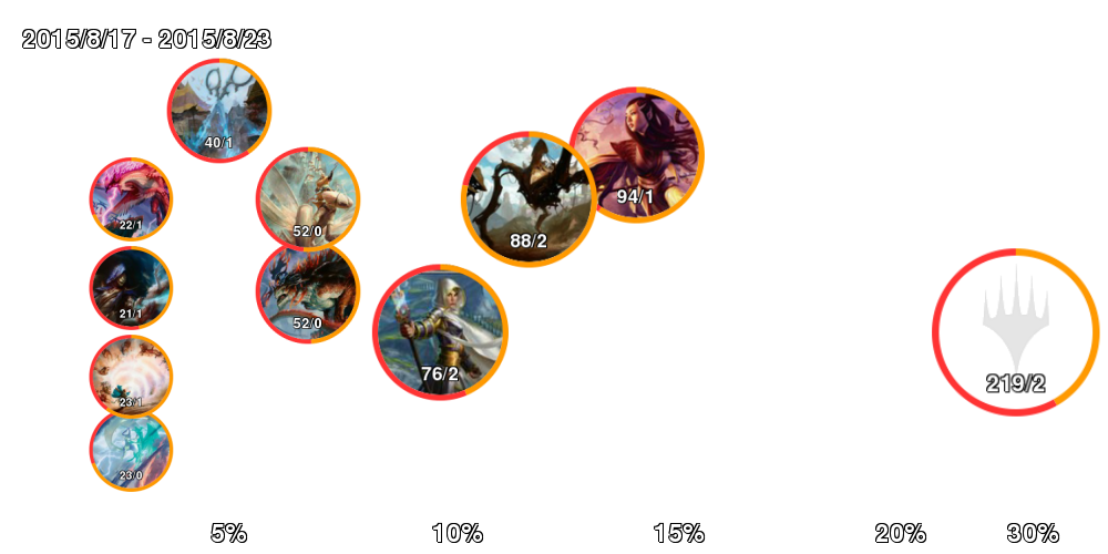 | アイコン中の数字は「掲載デッキ数/4-0デッキ数」。 アイコンの縁はオレンジの方が長ければ勢力拡大中、赤ならば勢力衰退中。 右側に行くほどTier1に近づいていき、下側に行くほどコントロール色が強くなる。 ただしアイコンが重ならないことを優先しているので位置はおおよそのもの。 |